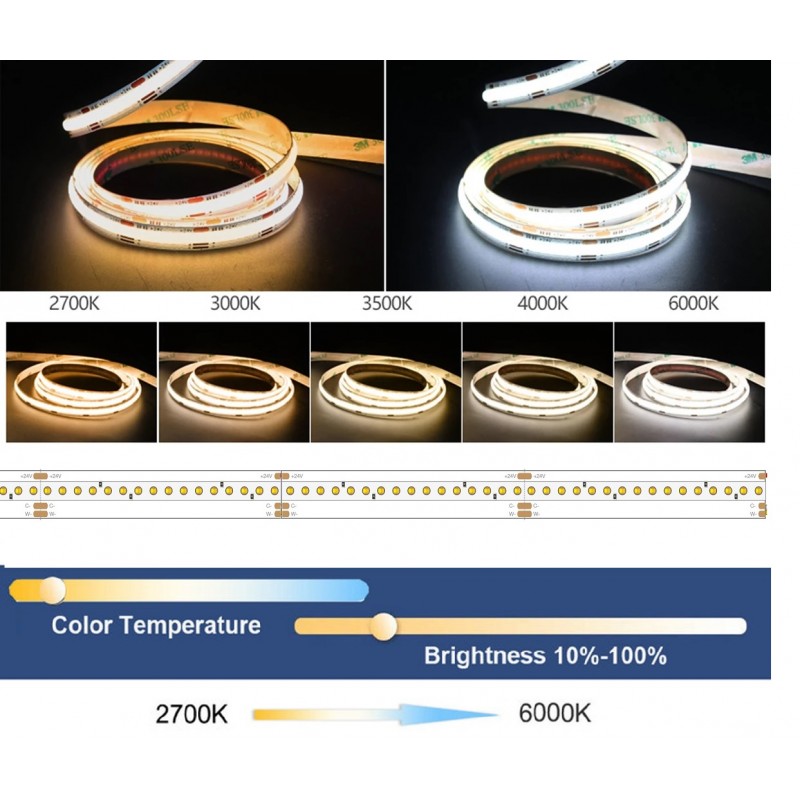 Tira LED Flexible 24V 20W/mt COB IP20 CCT 2700ºK a 6000ºK, Serie Profesional, rollo de 5 mts