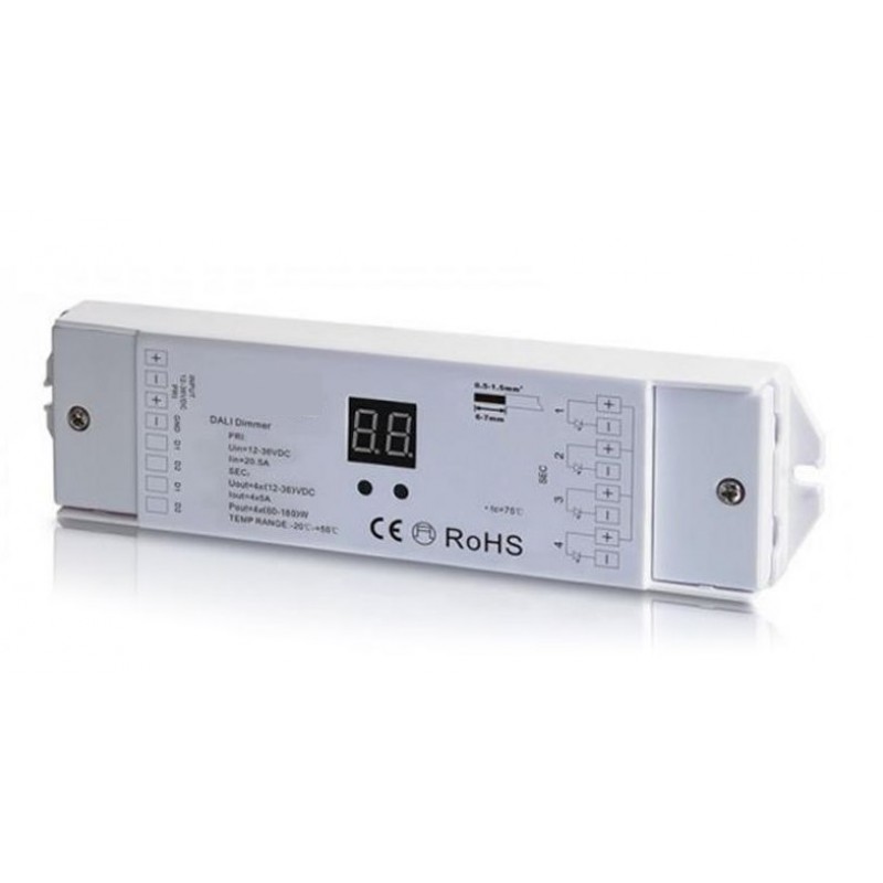 Receptor Controlador DALI para tira LED Monocolor, RGB y RGBW 12-36V 4 canales 4 direcciones 240-720W CRGB720DALI4D4C, Controlador de atenuación de voltaje constante con 4 canales, 5A por salida de canal, que cumple con el protocolo DALI estándar con 1 dirección DALI para controlar 4 canales de forma síncrona. La dirección DALI puede asignarse manualmente y mostrarse en la pantalla digital numérica o asignarse automáticamente por los controladores maestros.