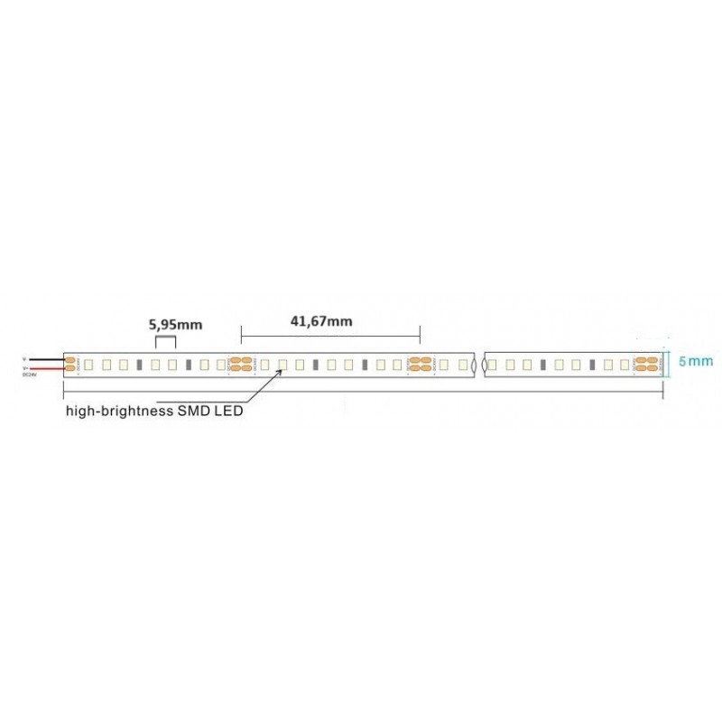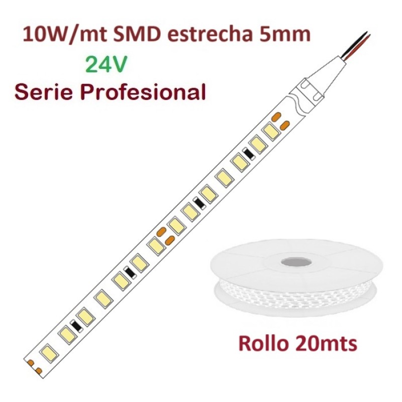 Tira LED Flexible 24V 10W/mt estrecha 5mm 168 Led/mt SMD 2835 IP20 Serie Profesional, Rollo 20mts TLF102835P24R20. Tira LED flexibles serie Profesional son de máxima calidad (High Quality) y se presentan con configuraciones de distintas medidas y prestaciones. Modelos estándar o estancos con distintos tipos de leds SMD como unidad de luz principal, en tipo 3528 y 5050, 2835, 3014 y 5630. Su flexibilidad y la dotación de accesorios permiten su aplicación en multitud de diseños de iluminación decorativa de bajo consumo con un gran ahorro de energía El formato de nuestras tiras de LED, viene en rollos de LED de 5 metros pudiéndose cortar en múltiplos de 5 cm, de ese modo se consigue acoplarlo en cualquier proyecto a medida. Las tiras de LED autoadhesiva, y presente diferentes grados de protección. A la hora de utilizar esta tira de LED, hay que tener en cuenta su intensidad lumínica, por lo que tendremos que poner un objeto cercano en el que proyecte la luz. Si su fin es como señalización, (delimitar pasillo, resaltar zonas de paso...) no es necesario buscar un objeto donde proyectar la luz.