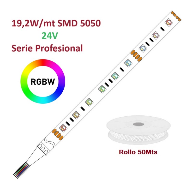 Tira LED Flexible 24V 19,2W/mt 60 Led/mt SMD 5050 IP20 RGBW, Serie Profesional, rollo 50 mts
