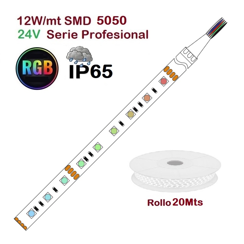 Tira LED Flexible 24V 12W/mt 60 Led/mt SMD 5050 IP65 RGB Serie Profesional, Rollo 20 mts