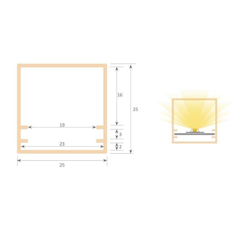 Perfil Cuadrado Policarbonato 25x25mm para tiras LED, barra 3 Metros