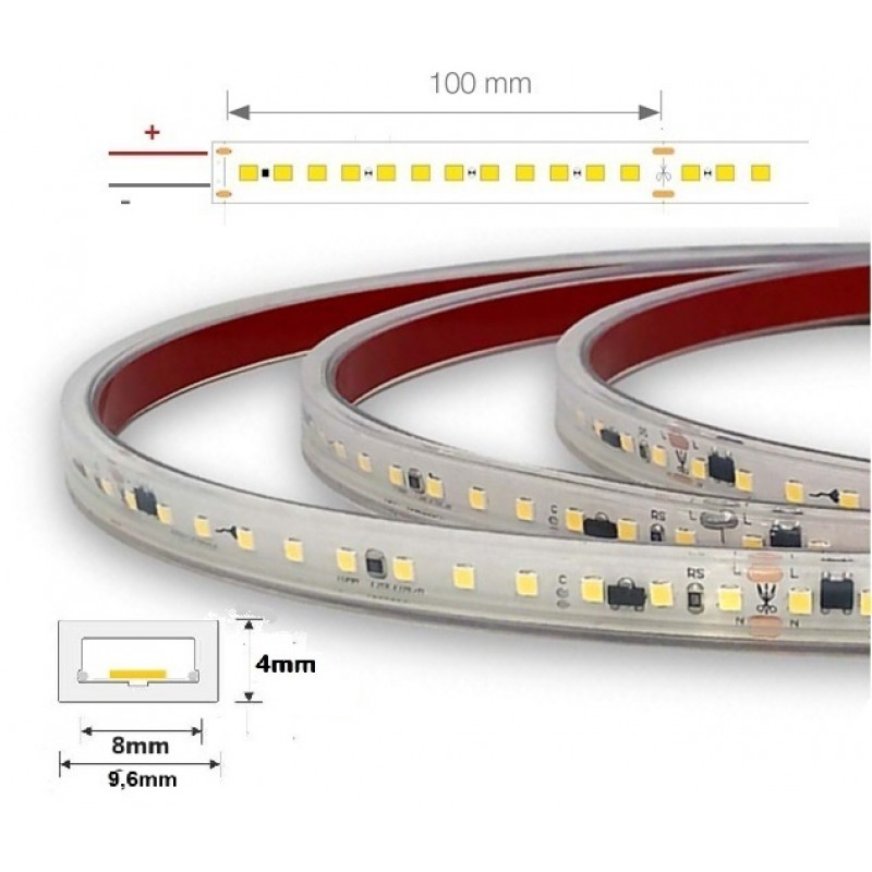 Tira LED 230V monocolor 5W/mt 120L/mt. SMD 2835 IP65 9,6x4mm corte cada 100mm, Venta por metros, desde 4,98€/m