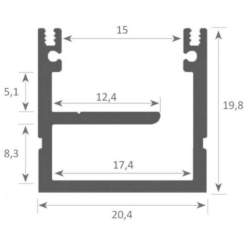 Perfil superficie aluminio anodizado 20,4x19,8mm para tiras LED, barra 2 Metros