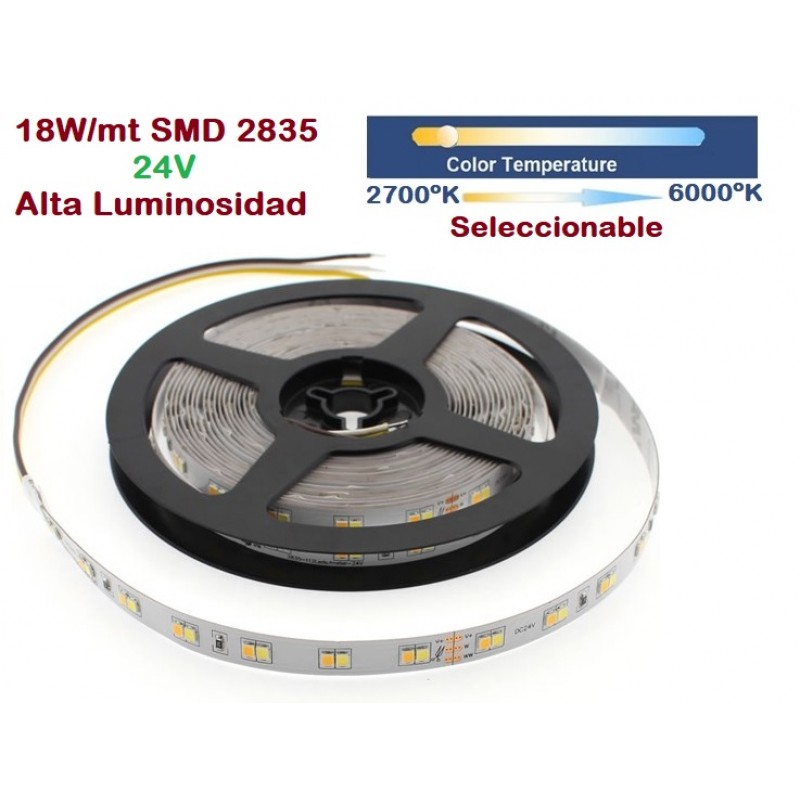 Tira LED 5 mts Flexible 24V 90W 600 Led SMD 2835 IP20 CCT 2700K a 6500K Alta Luminosidad