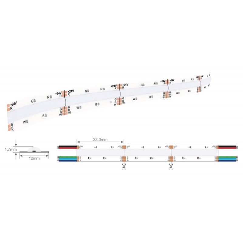 Tira LED 5 mts Flexible 24V 100W COB (840L/m) IP20 RGBW, Serie Profesional TLF100COBRGBWPRO24 20W/mt COB. Tira LED COB flexibles utiliza una solución técnica innovadora para ofrecer una línea de luz uniforme en toda la longitud de 5 m de la tira. Esto se logra utilizando una línea continua de fósforo amarillo, una tecnología conocida como Chip on Board (COB). Además, este enfoque ofrece un ángulo de visión ultra amplio de 140 grados con una alta alidad de luz.