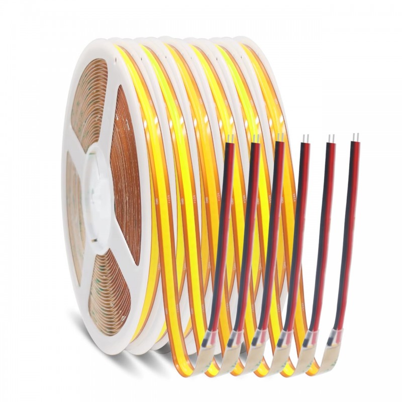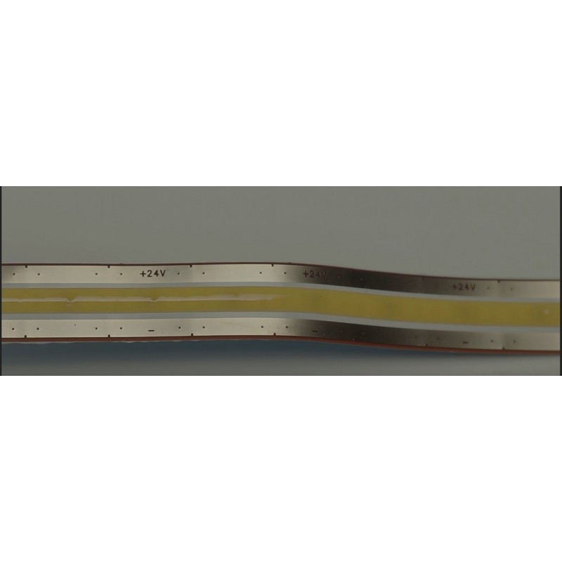 Tira LED Flexible 24V 20W/mt COB IP20, Serie DORE Profesional, rollo 6mts, rollo 6mts. TLF20COBP24D. Tira LED COB flexibles serie Profesional utiliza una solución técnica innovadora para ofrecer una línea de luz uniforme en toda la longitud de la tira. Esto se logra utilizando una línea continua de fósforo amarillo, una tecnología conocida como Chip on Board (COB). Además, este enfoque ofrece un ángulo de visión ultra amplio de 180 grados con una alta calidad de luz. Incorporan en la parte trasera del PCB una lámina de acero que ayuda en la disipación térmica, pero sobre todo que aporta una resistencia a la torsión un 80% mayor que el resto de las tiras COB del mercado.
