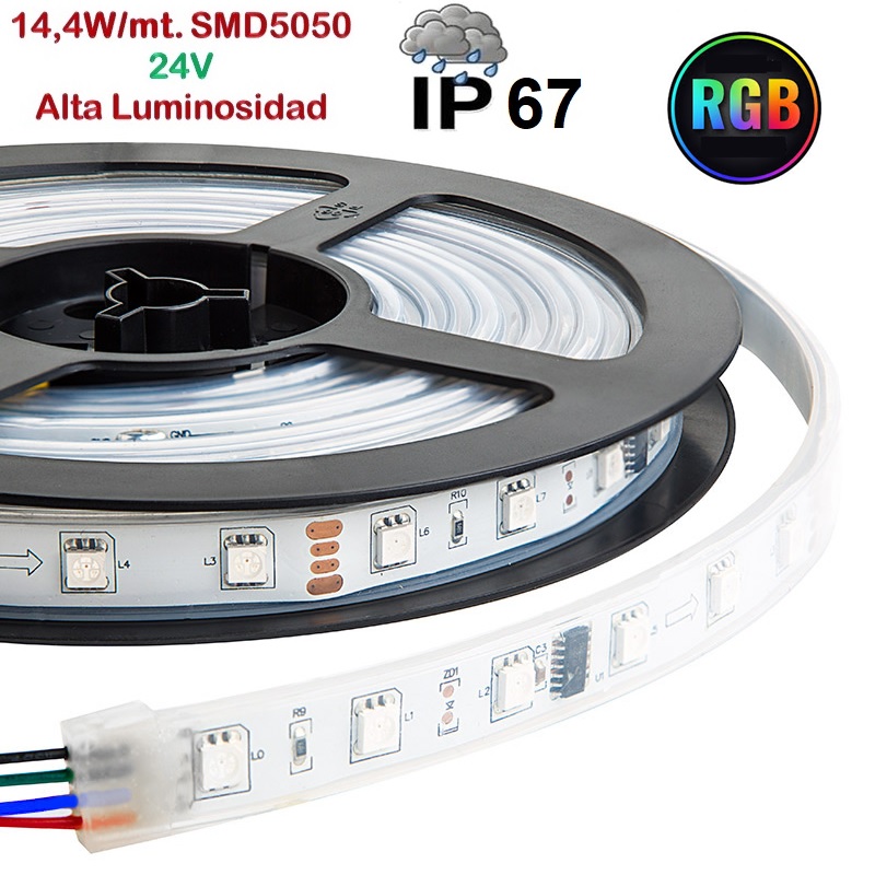 Tira LED 5 mts Flexible 24V 72W 300 Led SMD 5050 IP67 RGB Alta Luminosidad