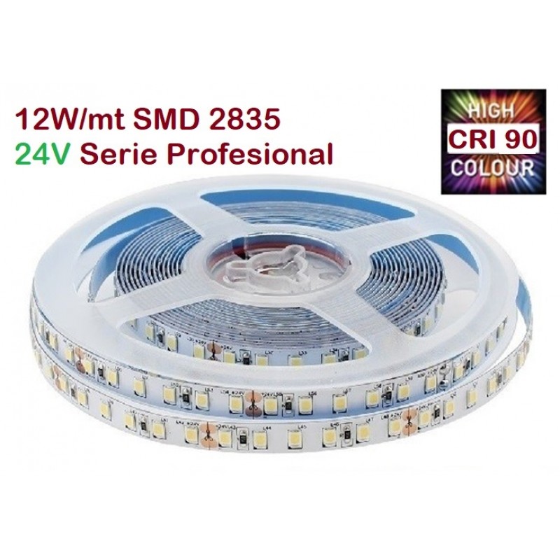 Tira LED 5 mts Flexible 24V 60W 600 Led SMD 2835 IP20, Serie Profesional TLF602835P24 12W/mt 120 Led/m. Tira LED flexibles serie Professional son de máxima calidad (High Quality), con IRC >90 y se presentan con configuraciones de distintas medidas y prestaciones. Este tipo de tira de LED trabaja con fuente de alimentación de 24V en corriente continua. Su flexibilidad y la dotación de accesorios permiten su aplicación en multitud de diseños de iluminación decorativa de bajo consumo con un gran ahorro de energía. Las tiras de LED es autoadhesiva y presente diferentes grados de protección. A la hora de utilizar esta tira de LED, hay que tener en cuenta su intensidad lumínica, por lo que tendremos que poner un objeto cercano en el que proyecte la luz. Si su fin es como señalización, (delimitar pasillo, resaltar zonas de paso,…) no es necesario buscar un objeto donde proyectar la luz.